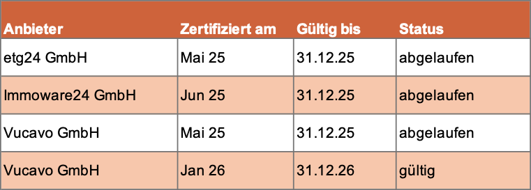 Der Prüfprozess, welcher bei Datenschutzkonformität mit der Vergabe eines Prüf-Zertifikats abgeschlossen wird, steht allen interessierten allen interessierten Immobilienverwaltungen und Softwareunternehmen offen.