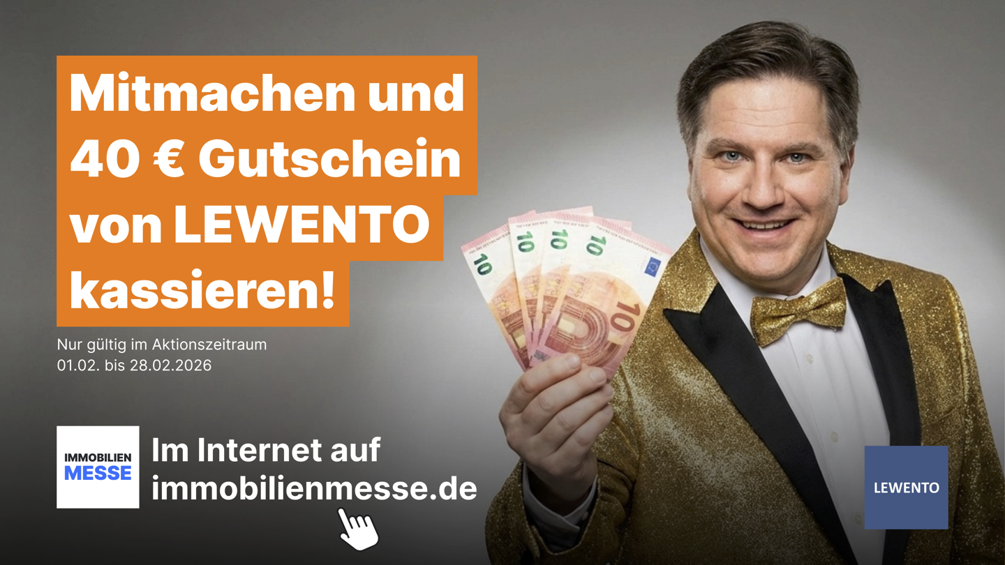 Alle, die sich während der Qualitätswochen neu auf der IMMOBILIENMESSE registrieren erhalten einen zusätzlichen 40 € Gutschein, einlösbar auf das LEWENTO Wissenspaket.